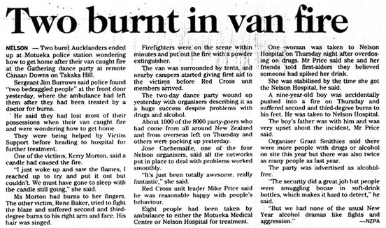 NELSON -- Two burnt Aucklanders ended up at Motueka police station wondering how to get home after their van caught fire at the Gathering dance party at remote Canaan Downs on Takaka Hill.