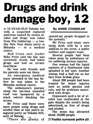 A 12-YEAR-OLD Takaka boy with a suspected ruptured pancreas caused by excess alcohol and drugs was taken from The Gathering - a two-day New Year dance party in Motueka - to a medical centre.