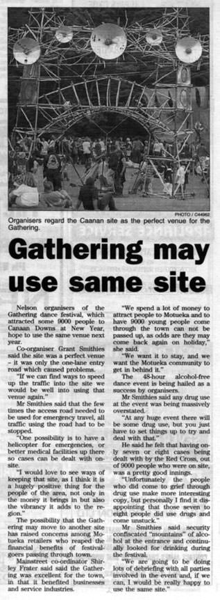 The possibility that the Gathering may move to another site had raised concerns among Motueka retailers who reaped the financial benefits of festival-goers passing through town. Mainstreet co-ordinator Shirley Frater said the Gathering was excellent for the town, in that it benefited businesses and service industries.