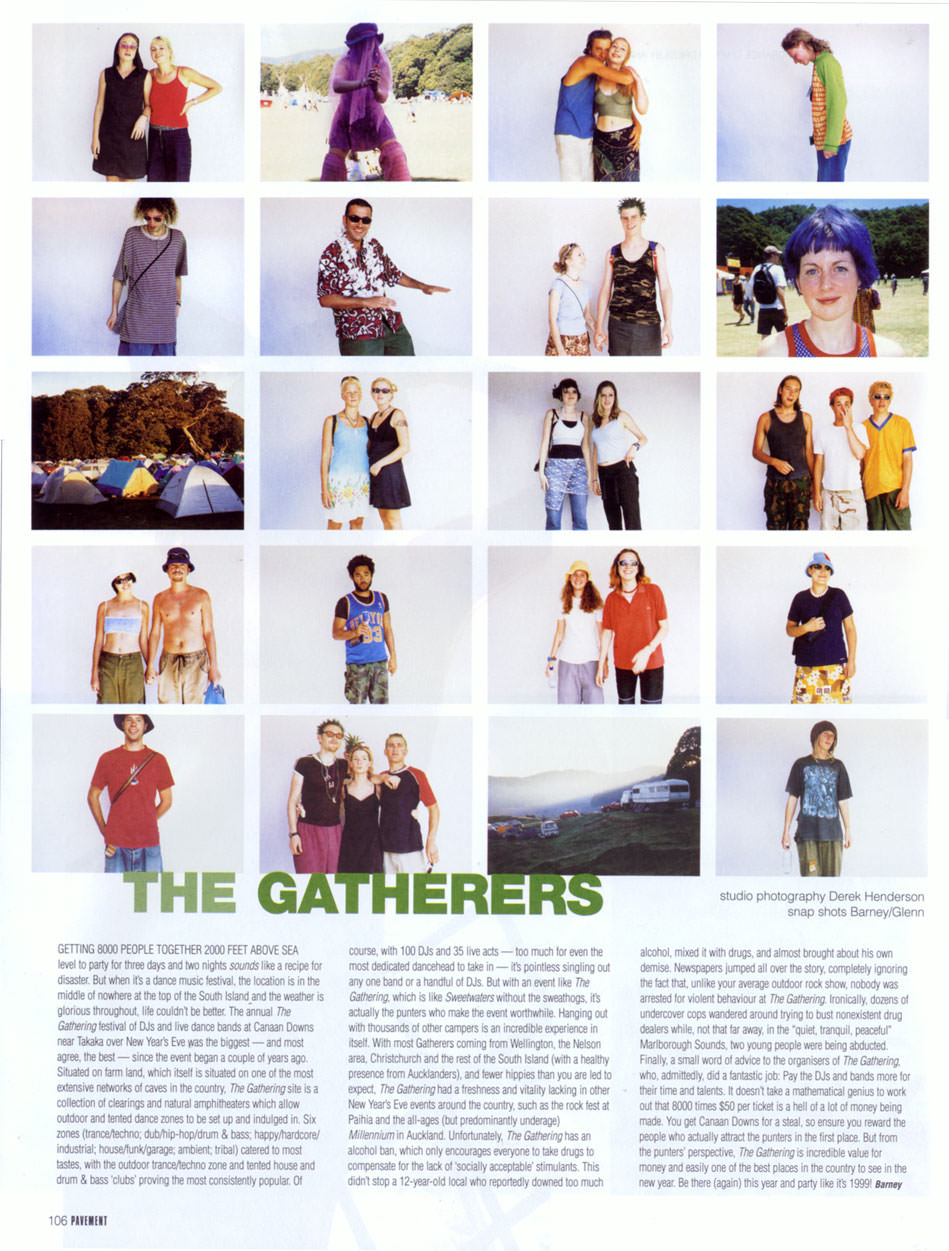 Of course, with 100 DJs and 35 live acts - too much for even the most dedicated dancehead to take in - it's pointless singling out any one band or a handful of DJs. But with an event like The Gathering, which is like Sweetwaters without the sweathogs, it's actually the punters who make the event worthwhile. Hanging out with thousands of other campers is an incredible experience in itself. With most Gatherers coming from Wellington, the Nelson area, Christchurch and the rest of the South Island (with a healthy presence from Aucklanders) and fewer hippies than you are led to expect, The Gathering had a freshness and vitality lacking in other New Year's Eve events around the country, such as the rock fest at Paihia and the all-ages (but predominantly underage) Millennium in Auckland.