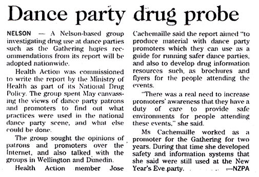 Health Action member Jose Cachemaille said the report aimed "to produce material with dance party promoters which they can use as a guide for running safer dance parties, and also to develop drug information resources such as brochures and flyers for the people attending the events. "There was a real need to increase promoters' awareness that they have a duty of care to provide safe environments for people attending these events," she said.