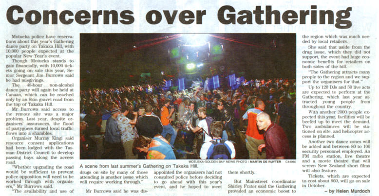 Though Motueka stands to gain financially, with 10,000 tickets going on sale this year, Senior Sergeant Jim Burrows said he had misgivings. The 48-hour non-alcohol dance party will agin be held at Canaan, which can be reached only by an 8km gravel road from the top of Takaka Hill.