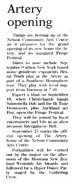September 25 marks the official opening of The Artery, home of the Nelson Community Arts Centre. Formalities will be carried out by the mayor on the afternoon of the Montana New Zealand Wearable Art Awards, and followed by a Hyper Dance Party staged by the Gathering Crew.