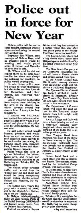 In Golden Bay, no large New Year's Eve events have been organised and most of the more upbeat celebration is expected to take place at the Gathering. Anne-Marie Gilligan from Pohara Beach Holiday Park said she expected most people would organise their own fun in small family groups. Takaka police constable Peter Crins said the usual patrols would be done but he expected the Gathering to make things pretty quiet elsewhere.