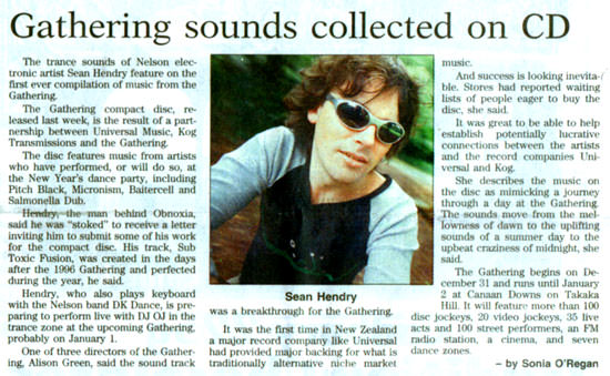 Hendry, the man behind Obnoxia, says he was "stoked" to receive a letter inviting him to submit some of his work to the compact disc. His track, Sub Toxic Fusion, was created in the days after the 1996 Gathering and perfected during the year, he said. Hendry, who also plays keyboard with the Nelson band DK Dance, is preparing to perform live with DJ OJ in the trance zone at the upcoming Gathering, probably on January 1.