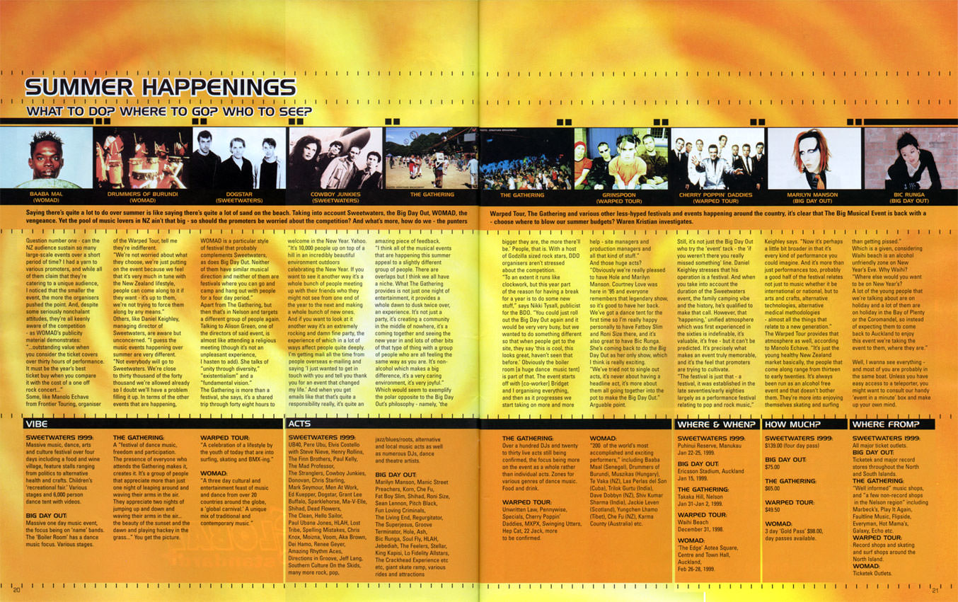 Saying there's quite a lot to do over summer is like saying there's quite a lot of sand on the beach. Taking into account Sweetwaters, the Big Day Out, WOMAD, the Warped Tour, The Gathering and various other less-hyped festivals and events happening around the country, it's clear that The Big Musical Event is back with a vengeance. Yet the pool of music lovers in NZ ain't that big - so should the promoters be worried about the competition? And what's more, how do we - the punters - choose where to blow our summer budgets? Waren Kristian investigates.