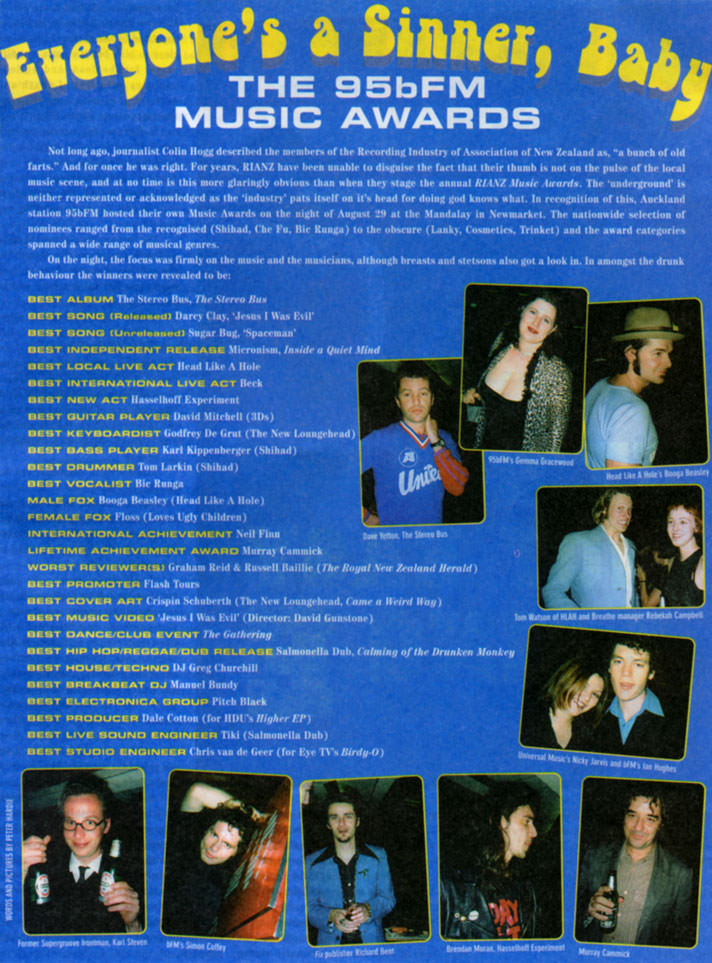Not long ago, journalist Colin Hogg desribed the members of the Recording Industry Association of New Zealand as, "a bunch of old farts." And for once he was right. For years, RIANZ have been unable to disguise the fact that their thumb is not on the pulse of the local music scene, and at no time is this more glaringly obvious than when they stage the annual RIANZ Music Awards. The 'underground' is neither represented or acknowledged as the 'industry' pats itself on its head for doing god knows what. In recognition of this, Auckland station 95bFM hosted their own Music Awards on the night of August 29 at the Mandalay in Newmarket. The nationwide selection of nominees ranged from the recognised (Shihad, Che Fu, Bic Runga) to the obscure (Lanky, Cosmetics, Trinket) and the award categories spanned a range of music genres.