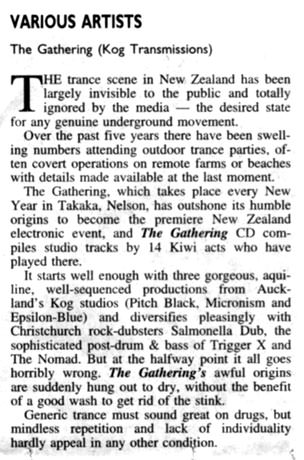 The Trance scene in New Zealand has been largely invisible to the public and totally ignored by the media - the desired state for any genuine underground movement [Actually, The Gathering is waaaaaay more than just Trance - try Trance/Techno, Dub/HipHop/Drum&Bass/Roots, Happy/Hardcore/Industrial/Hardbag, House/Funk/Garage, Ambient/Lounge, Tribal, Jazz/Classical/World - and as for being 'totally ignored' - perhaps Gary should take a look at our media archives... WebEd]