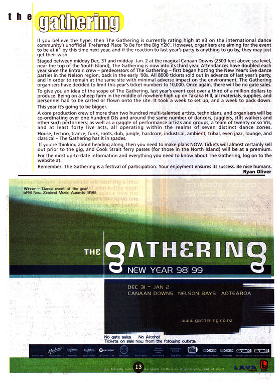 Staged between midday Dec 31 and midday Jan 2 at the magical Canaan Downs (2500 feet above sea level, near the top of the South Island), The Gathering is now into its third year. Attendances have doubled each year since the Entrain crew - predecessors of The Gathering - first began hosting the New Year's Eve dance parties in the Nelson region, back in the early '90s. All 8000 tickets sold out in advance of last year's party, and in order to remain at the same site with minimal adverse impact on the environment, The Gathering organisers have decided to limit this year's ticket numbers to 10,000. Once again, there will be no gate sales.