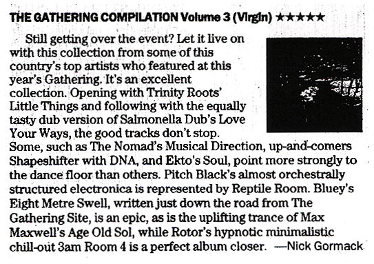 Still getting over the event? Let it live on with this collection from some of this country's top artists who featured at this year's Gathering. It's an excellent collection. Opening with Trinity Roots' Little Things and following with the equally tasty dub version of Salmonella Dub's Love Your Ways, the good tracks don't stop. Some, such as The Nomad's Musical Direction, up-and-comers Shapeshifter with DNA, and Ekto's Soul, point more strongly to the dance floor than others. Pitch Black's almost orchestrally structured electronica is represented by Reptile Room. Bluey's Eight Metre Swell, written just down the road from The Gathering Site, is an epic, as is the uplifting trance of Max Maxwell's Age Old Sol, while Rotor's hypnotic minimalistic chill-out 3am Room 4 is a perfect album closer.