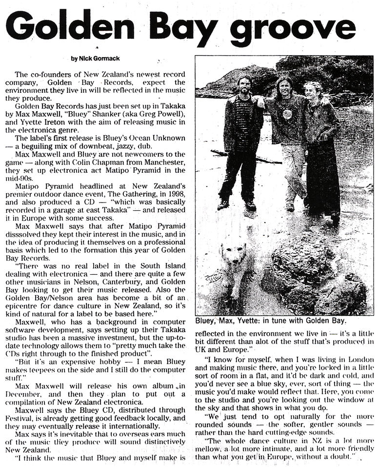 Golden Bay Records has just been set up in Takaka by Max Maxwell, "Bluey" Shanker (aka Greg Powell), and Yvette Ireton with the aim of releasing music in the electronica genre.