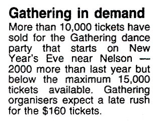 More than 10,000 tickets have sold for the Gathering dance party that starts on New Year's Eve near Nelson - 2000 more than last year but below the maximum 15,000 tickets available. Gathering organisers expect a late rush for the $160 tickets.