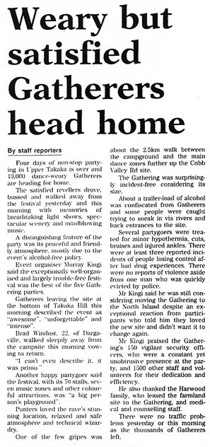 Four days of non-stop partying in Upper Takaka is over and 13,000 dance-weary Gatherers are heading for home.