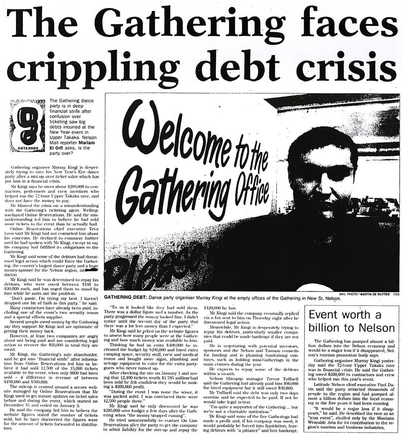 Gathering organiser Murray Kingi yesterday said the 72-hour Upper Takaka rave was in financial crisis. He said the Gathering owed $200,000 to contractors and crew who helped to run this year's event.