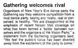 Organisers of New Year's Eve dance party the Gathering say they welcome competition from a rival dance party, saying any rivalry, real or perceived, is healthy. "We are disappointed at the emphasis of recent Nelson Mail coverage on what has been termed a 'battle' between ourselves and the organisers of the Vision Party," a statement from the Gathering organisers said. "We feel the public's focus has been diverted away from the excitement of the party to come."