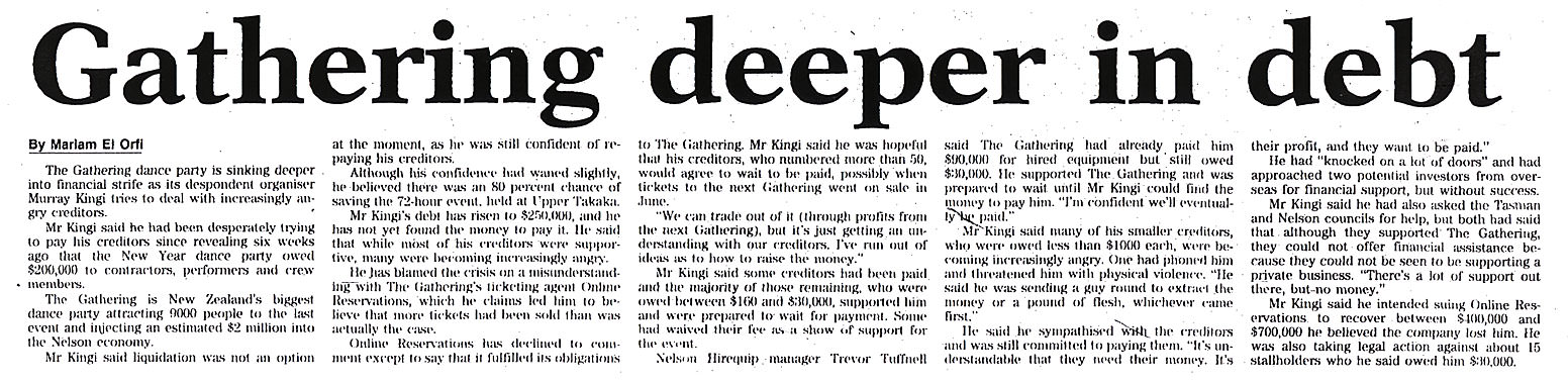 Online Reservations has declined to comment except to say that it fulfilled its obligations to The Gathering. Mr Kingi said he was hopeful that his creditors, who numbered more than 50, would agree to wait to be paid, possibly when tickets to the next Gathering went on sale in June.