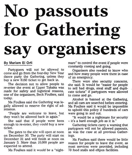 Partygoers will not be allowed to come and go from the four-day New Year dance party the Gathering, unless they buy a new $160 ticket to get back in.