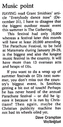 If you want to do a wrap up of summer festivals or DJs next summer, you don't miss out the country's biggest event. Is Smithies getting a bit out of touch? Perhaps he has never heard of the annual Parachute festival - or did he ignore it because it is run by Christians? Then again, maybe the Christian publicity machine has not had its wheels oiled yet.