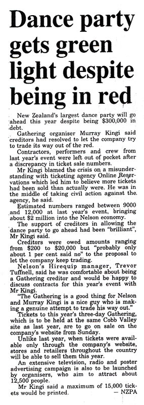 Nelson's Hirequip manager, Trevor Tuffnell, said he was comfortable about being a Gathering creditor and would be happy to discuss contracts for this year's event with Mr Kingi. "The Gathering is a good thing for Nelson and Murray Kingi is a nice guy who is making a genuine attempt to trade his way out."